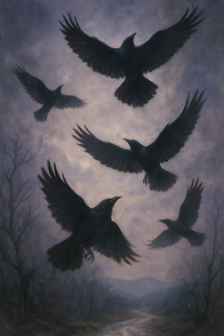 Then the heavens erupted—a storm of wings and cries as a hundred crows and a single white raven wheeled above them, darkening the sky with an omen that made the very air tremble.